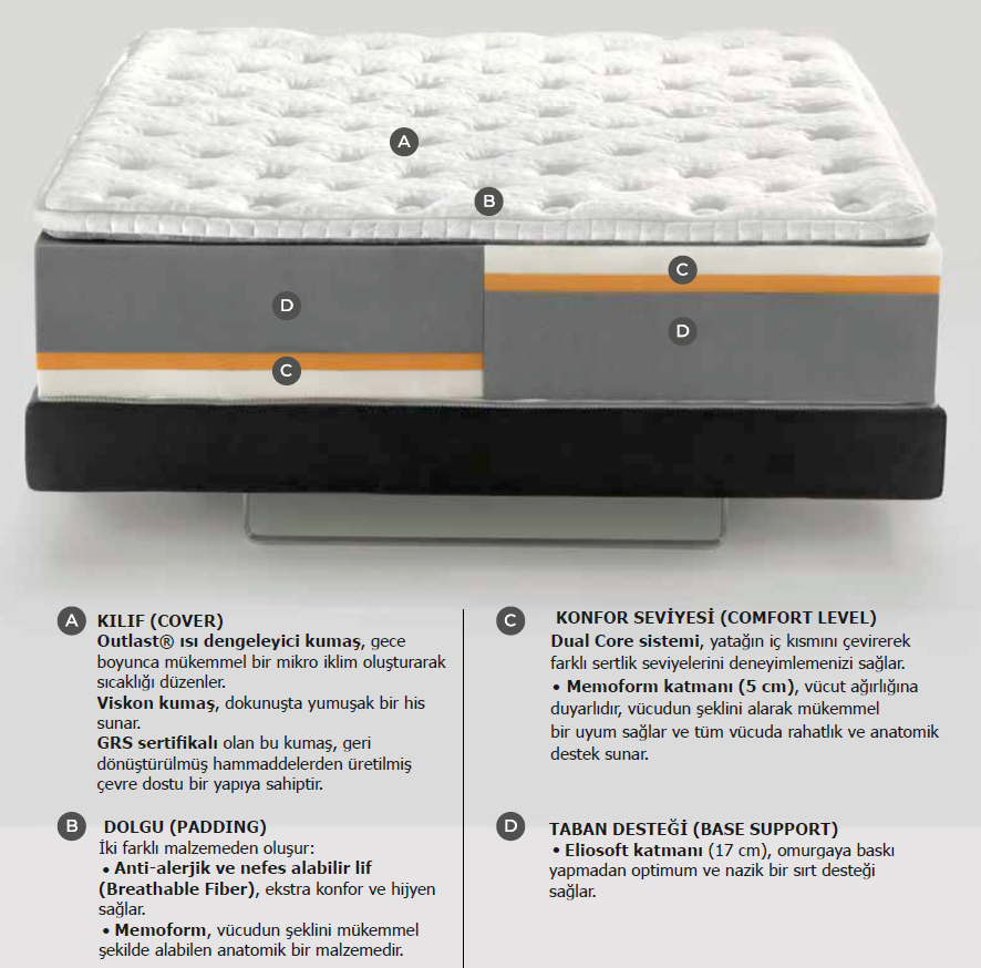 • C & D - İç Çekirdek (Comfort & Base Support): Yatağın kalbi, 5 cm'lik anatomik Memoform katman ve 17 cm'lik Eliosoft  taban desteğinden oluşur. Vücut ağırlığına duyarlı olan Memoform katman, vücuda tam uyum sağlayarak basınç noktalarını azaltır ve kan dolaşımını teşvik eder. Eliosoft katmanı ise omurgaya baskı yapmadan optimum ve nazik bir sırt desteği sunar.